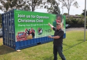 Hope radio filling up shipping container with Operation Christmas Child shoe boxes