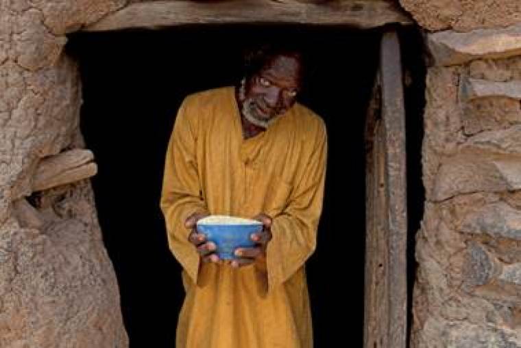 Djougal Tapily, an elder in the town of Bandiagara, survives with his wife and their family of six on millet supplied by Christian Aid partner Action Promotion Humanitarian (APH). A small breakfast bowl of the cereal uncooked is the daily allowance for two adults.