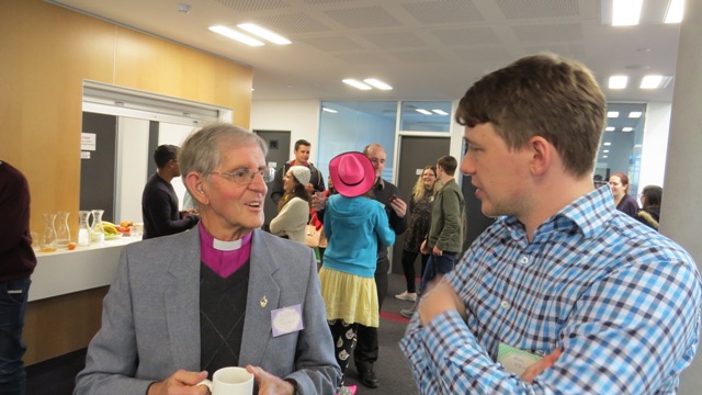 Photo  -   Bishop Brian Carrell and Tim Newman in Christchurch at the young writers conf